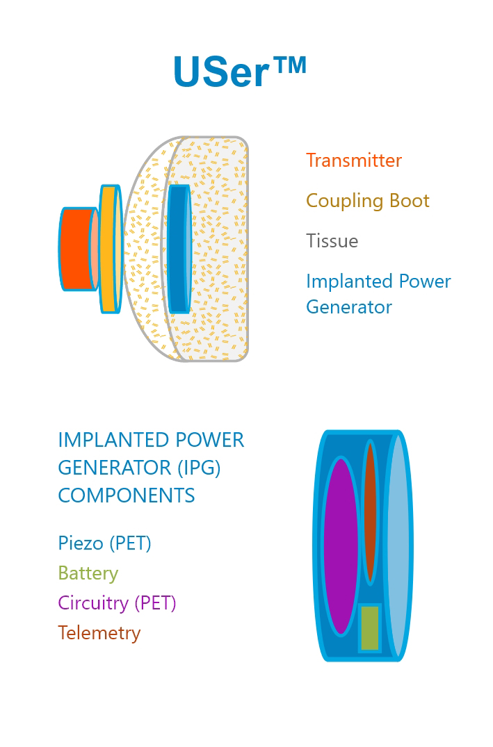 Active Ultrasound Electrical Recharging (USer) uses ultrasonic pressure waves to transfer energy through tissue to a receiver and then to a rechargeable battery or capacitor. Power can also be provided to an application for direct use. This project was originally funded by Phase I and Phase II SBIR grants from the National Institutes of Health.
